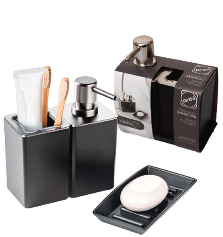 AÇO ESCOVADO - CJ BANHEIRO - DISPENSER/ P.ESCOVA/ SABONETEIRA Peso: 0,2 kg Altura (cm): 17 Comprimento (cm): 15 Largura (cm): 8 Material: Plasticos