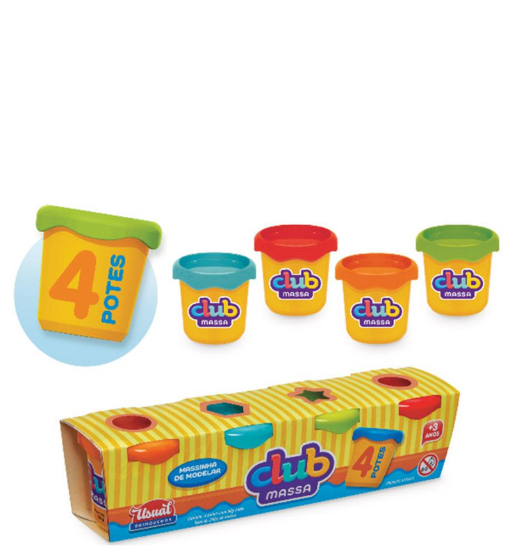CLUB MASSA KIT 04 POTES (50G) Peso: 0,2 kg Altura (cm): 6 Comprimento (cm): 23 Largura (cm): 5 Material: Brinquedos
