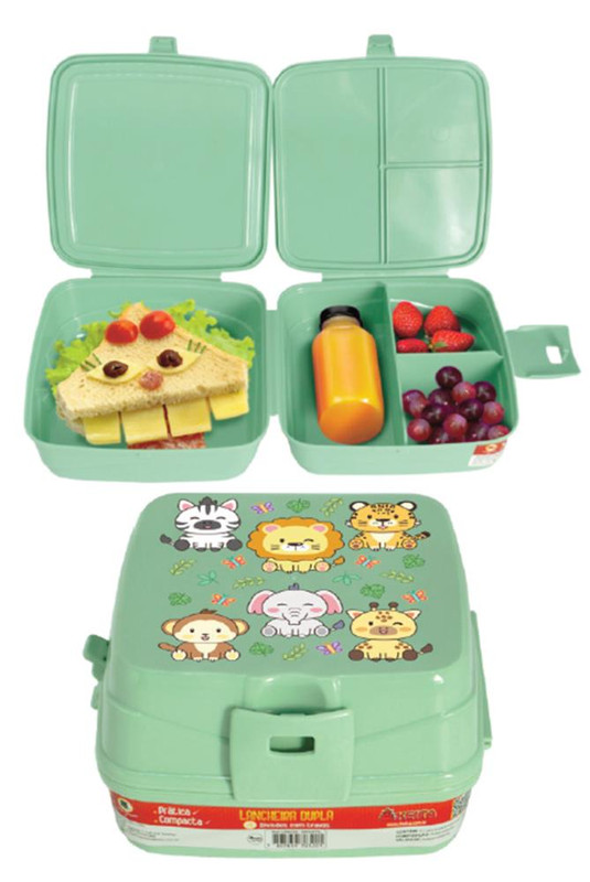 LANCHEIRA DUPLA C/ DIV SAFARI - VERDE 15 X 14,5 X 9,5CM Peso: 0,18 kg Altura (cm): 5 Comprimento (cm): 34 Largura (cm): 31 Material: Plasticos