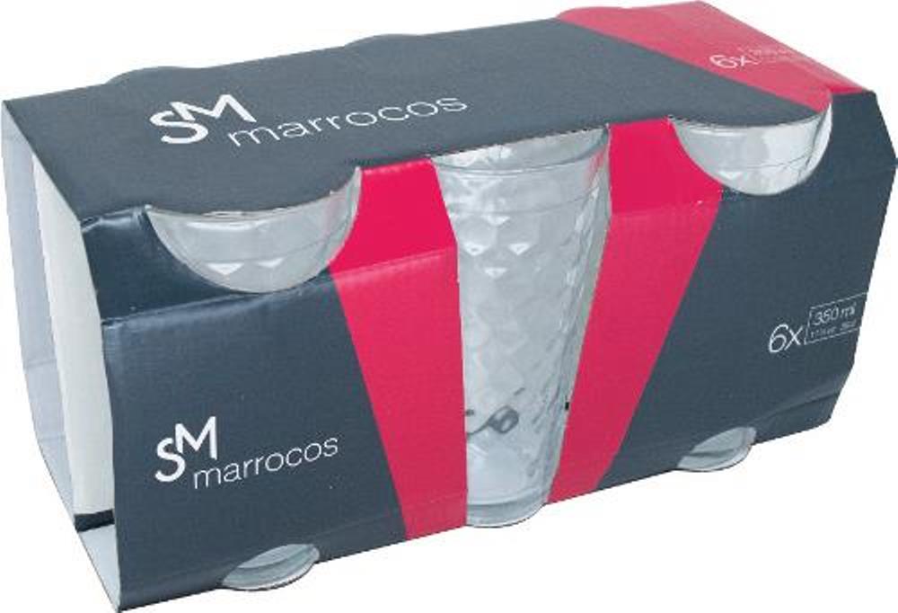 MARROCOS COPO JG C/ 6 350ML Peso: 0,23 kg Altura (cm): 13,8 Comprimento (cm): 7,6 Largura (cm): 7,6 Material: Vidros