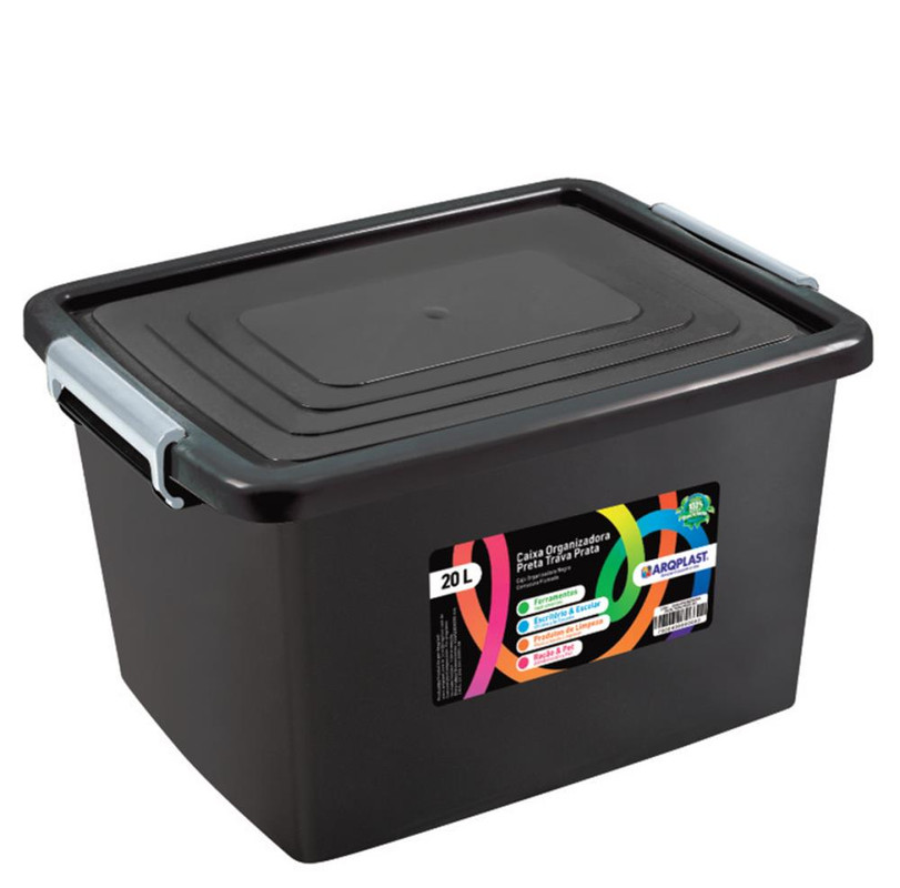 ORGANIZADOR C/ TRAVA 20L PRETA 40 X 30 X 23 CM Peso: 0,68 kg Altura (cm): 23 Comprimento (cm): 41 Largura (cm): 35 Material: Plasticos